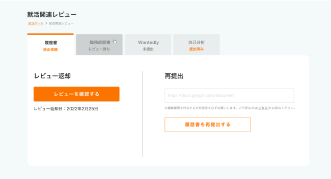 アプリ内でキャリアトレーナーに職務経歴書・履歴書・Wantedlyプロフィールのレビュー依頼をすることができ、添削のやりとりをすることが可能です。(※現在、添削に回数制限はございません。)