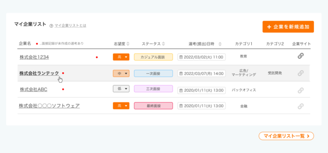 自分だけの企業リストを作成し、選考状況を登録してスケジュール管理をしたり面接記録を企業ごとに振り返ることが可能です。