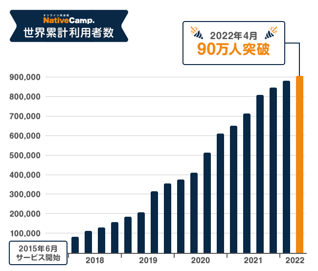 ネイティブスピーカーと回数無制限のオンライン英会話サービス「ネイティブキャンプ英会話」を展開する株式会社ネイティブキャンプ(東京都渋谷区 代表取締役:谷川国洋)は、世界累計利用者数が90万人を突破したことをお知らせいたします。