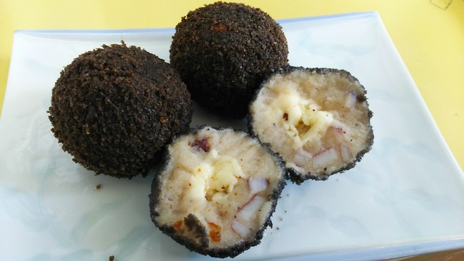 イカ墨を混ぜて作った真っ黒い衣に、中はイカとチーズが入ったコロッケです。