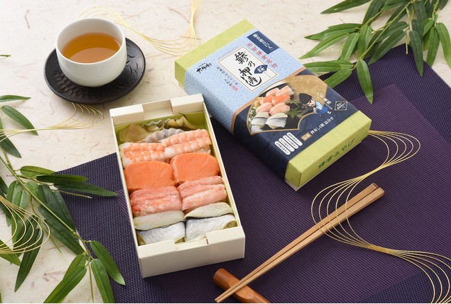 108年間販売している「鯵の押寿し」に、「カニ」「エビ」「サーモン」を詰め合わせました。