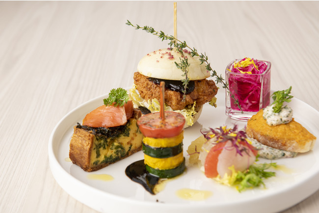 「5th Anniversary "AICHI" Plate」は、店舗の地元“愛知”をテーマに、ご当地食材をサラベスならではのアプローチでアレンジし、創作した6種のメニューアイテムをワンプレートにしたスペシャルプレート。様々な味をお楽しみいただけるよう、サイズ感にも考慮した「トマトとズッキーニのピンチョス ブラックオリーブピュレ」、「真鯛のカルパッチョ アグロドルチェ」、「ケールとグリエールのキッシュ スモークサーモン添え」、「シュリンプトースト レムラードソース」、「名古屋コーチンスライダー バルサ味噌ソース」、「赤キャベツのマリネ」といった全6アイテムがプレートを華やかに彩ります。また、コーヒーまたは紅茶もお付けしました。デザートとして、サラベス人気の“NYチーズケーキ”をベースに、濃厚な風味のジャージークリーム、平飼いの卵を使用して仕上げた、プレミアム感たっぷりの「プレミアムチーズケーキ」を追加でお付けすることも可能です(※プラス500円)。