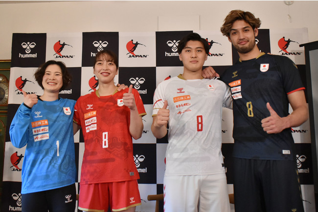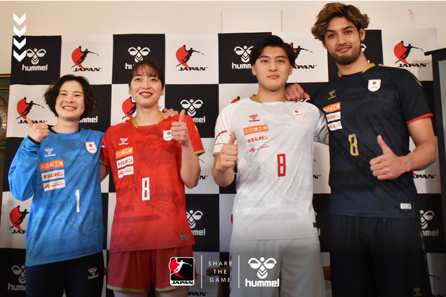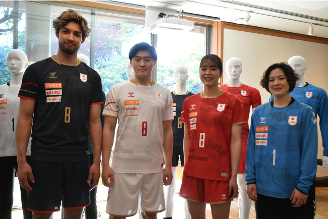 男子代表・彗星JAPANから部井久アダム勇樹選手と蔦谷大雅選手、女子代表・おりひめJAPANより馬場敦子選手と中山佳穂選手が来場。新ユニフォームは、日の丸や扇子といった日本伝統の和柄日本らしい柄を組み合わせてデザインしたもので、4選手は、2022年度からハンドボール日本代表が着用するユニフォームをまとい、「日本らしい和柄のデザインで、早くこのユニフォームを着用して試合がしたい」とそれぞれ口にした。