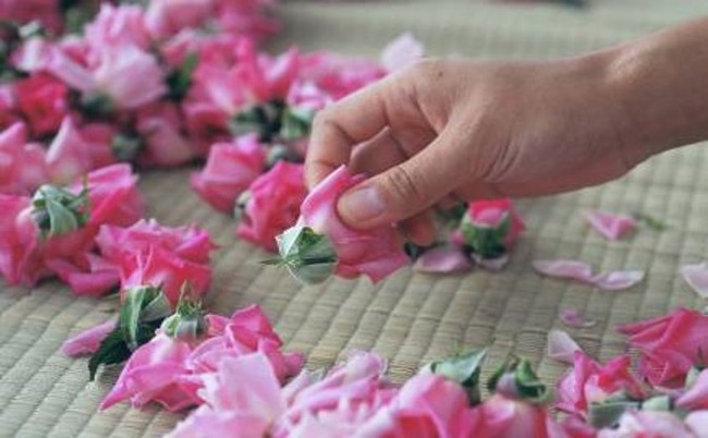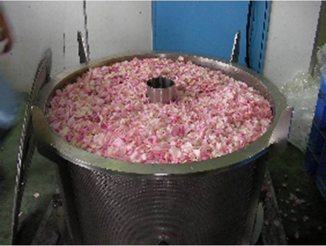 一般的に食用バラなどで行われる機械による花の採取は、傷つきやすく、成分の抽出において変質するため、当社では、すべて手摘みでバラの香りが最も芳しい朝、成分が最も抽出しやすいタイミングを見計らって採取し、花びら・がく(子房)に仕分けすることによって、それぞれから成分を抽出し、バラの有効利用に努めています。専門の採取者によって採取した鮮度の高いバラのみを使用。この採取・選別技術が国産初の生バラから、成分を抽出することに成功した秘訣です。育てられたバラは、観賞用としても十分に美しいバラですが、化粧品成分を抽出するためだけに栽培しており、少しでも廃棄する部分を減らし、バラの美しさや、その力を大切にしたいと考えています。
