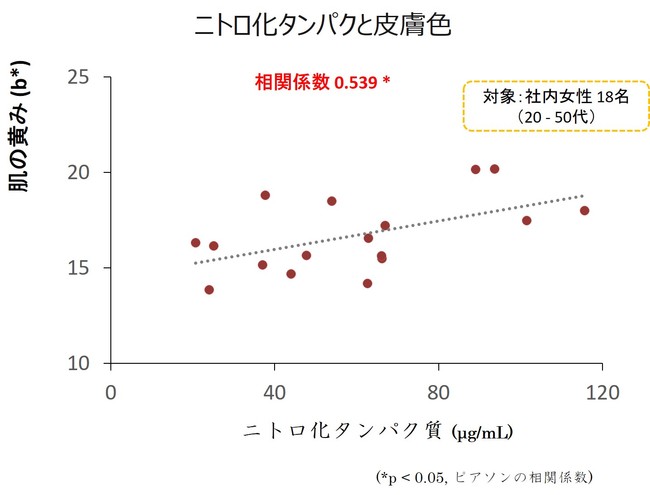 当社は、肌の老化現象のひとつであるニトロ化についての研究を行っており、2020年に開催された国際学会IFSCC Congress 2020においても肌の光老化にニトロ化の関与があることを発見したことを発表しています。(和文タイトル:細胞外マトリクスのニトロ化が光老化を加速する:エラスチン沈着と弾力性低下への関与について)。加齢により、皮膚色は徐々に黄色くくすんでくることがわかっており、肌のニトロ化は肌の弾力性を失うこともわかっており、今回は、ニトロ化を防ぐことにより、肌の黄色化を防ぐとともに弾力の劣化を防ぐことを目的として研究を進めました。