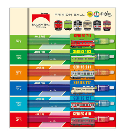 「国鉄時代から活躍する車両」をプレートにデザインしたフリクションボールペンの6本セット。カラーリングはJR6社カラーをイメージしており、全国で1,000セット発売の限定シリアル番号付きです。