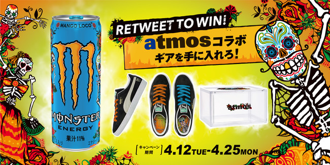 本キャンペーンは、第1弾のコラボレーションで大好評だった日本限定のatmosコラボスニーカーに加え、マンゴーロコのモチーフであるガイコツのイラストが施されたコラボスニーカーBOXがセットになった豪華賞品が当たるモンスターファン、atmosファン必見のキャンペーンです。4月12日(火)~ 4月25日(月)の期間中、モンスターエナジージャパン公式Twitterアカウント(@MonsterEnergyJP)をフォローし、対象のツイートをリツイートした後に、専用応募フォームにアカウント情報やスニーカーの希望サイズを入力して応募すると抽選で20名様に当たります。