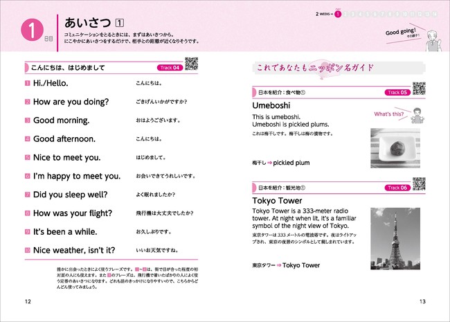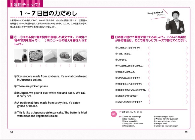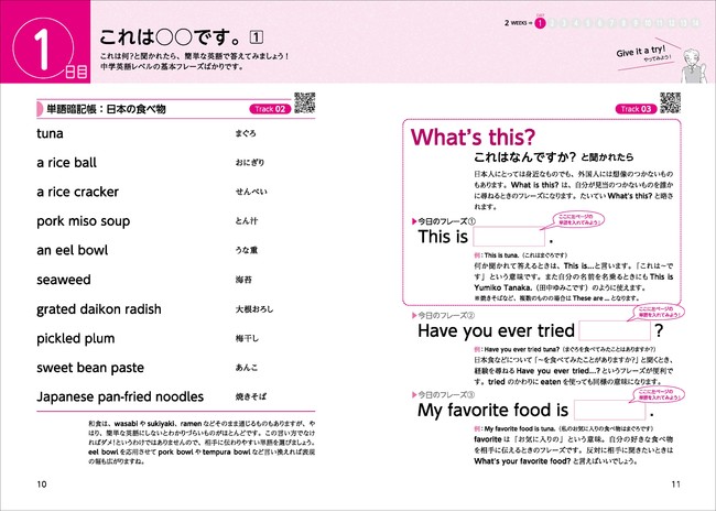 ドリルは初心者が英語を話すための実践的な内容。挨拶や自己紹介など基本の表現以外に、日本の紹介をテーマに、身近なものを英語ではどう言うのか、簡単な表現でどう伝えるのかなどもわかり、毎日ワクワク続けられます。