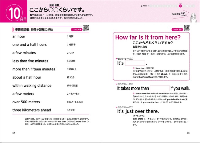 「毎日単語・フレーズを10個」「数のかぞえ方」「時間の表現」「道案内」など、簡単な課題にもトライ。覚えているようで、意外に忘れている内容ばかりで、「あぁ、これって中学生のころに習ったな」などと楽しく取り組めます。ドリルと連動した音声も聞けるので、耳を慣らし、口に出すことでも英語の感覚をとり戻し、無理なく英語をやり直せます。