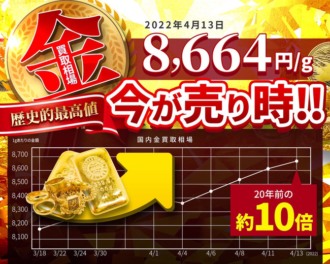 【金買取相場史上最高値!】2022年4月13日(水)金買取の国内公表価格『8,664円/g』と過去最高値を更新!