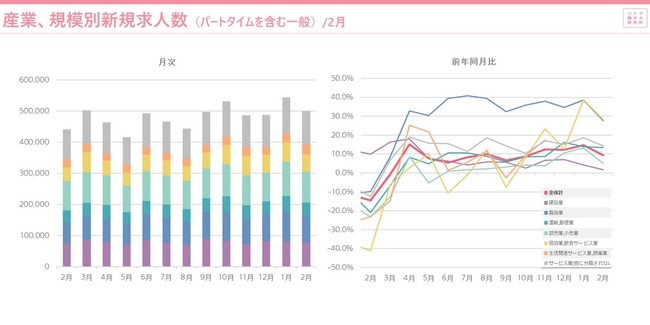 新規求人数は、前年比で9.5%増とやや改善しました。伸び率が高い産業のトップ3は、飲食サービス業(28.4%増)、製造業(27.6%増)、情報通信業(18.1%増)。コロナ禍に直撃された宿泊業,飲食サービス業が、先月伸び率トップとなりましたが、今月もトップを維持しております。