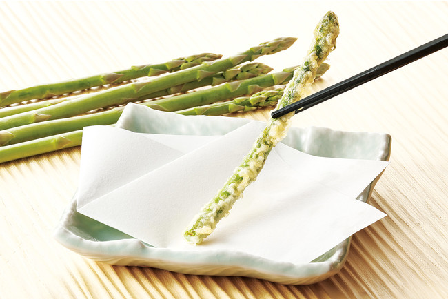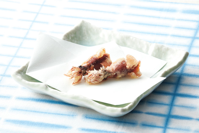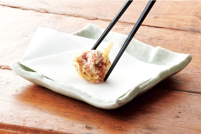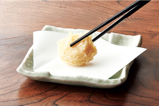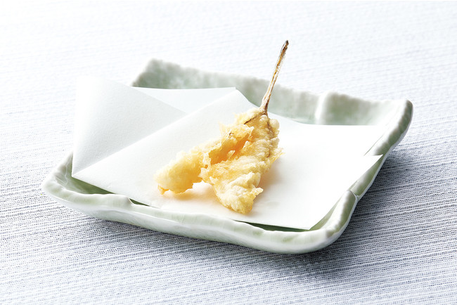 『初夏天丼』は、宮城県気仙沼港で水揚げされ、静岡県焼津にて藁でいぶし香ばしくたたきにした、「鰹のたたき」を天ぷらにしてのっけた一品。旨みのつまった“あさり”と“生姜”を組み合わせた、「あさりと生姜のかき揚げ(三つ葉入り)」との相性は抜群です。天ぷらによくあう「めごち」と、“岩下の新生姜(R)”でおなじみの、岩下食品株式会社から「新芽生姜」、アクセントとなる「紀州南高梅」で、爽やかな風味と食感のあるバランスのよい天丼に仕上げました。