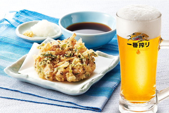 初夏天丼に使用している「あさりと生姜のかき揚げ」と生ビールがセットになった、てんやのちょい飲みセットです。