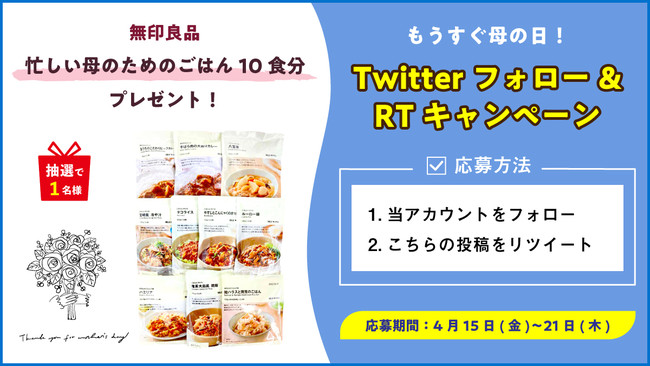 会期中、西武東戸塚S.C.公式Twitterをフォローし、対象ツイートをリツイートしてくださった方の中から抽選で1名さまに《無印良品 忙しい母のためのごはん 10食分》(レトルトカレーやごはんにかけるシリーズ)をプレゼントいたします。