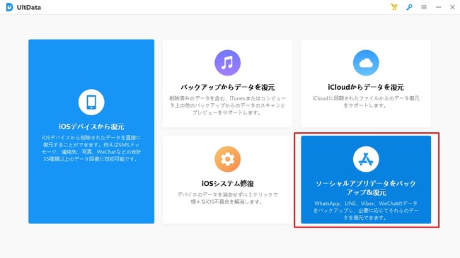 01、ソフト「UltData」を起動し「ソーシャルアプリデータをバックアップ&復元」をクリックします。