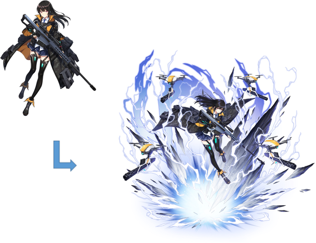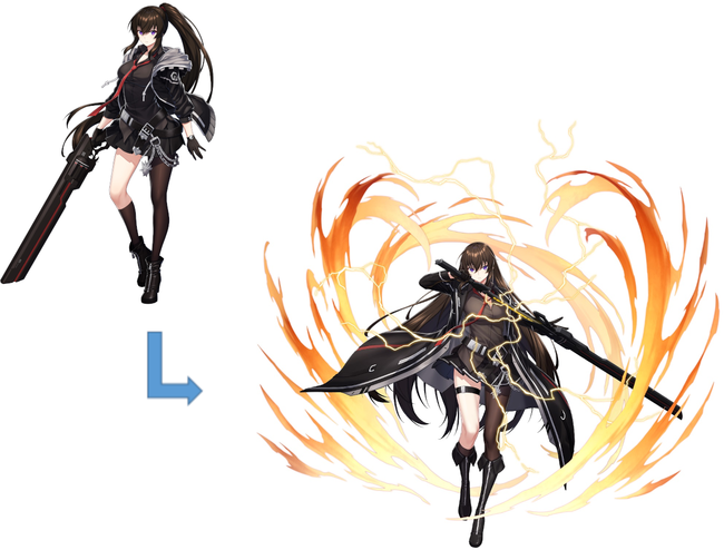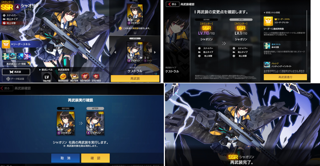 「極秘再武装データ」(SSR用)「再武装データ」(SR以下レアリティ用)を消費して「再武装」を行うことで、名称ならびに外見の変化やレアリティアップ、新たなリーダー/基本スキルの獲得・既存スキルの最大レベルアップのほか、一部キャラクターではクラスの変更などが行われます。