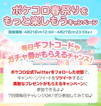 ココネ株式会社(本社:東京都世田谷区、以下「ココネ」)は、アバターの着せ替えやお客様同士のコミュニケーションを楽しむスマートフォン向けアプリ『ポケコロ』において、合計10,315名分の賞品を用意した「ポケコロ春祭りをもっと楽しもうキャンペーン」を2022年4月21日(木)より開始します。