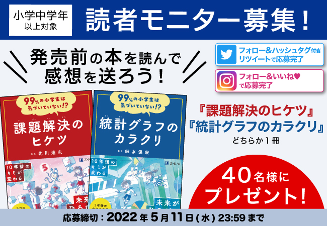 読者モニターには発売前の『99%の小学生は気づいていない!? 課題解決のヒケツ』、『99%の小学生は気づいていない!? 統計グラフのカラクリ』のどちらか1冊をプレゼント!読んでいただいた感想、アンケートにご協力いただきます。