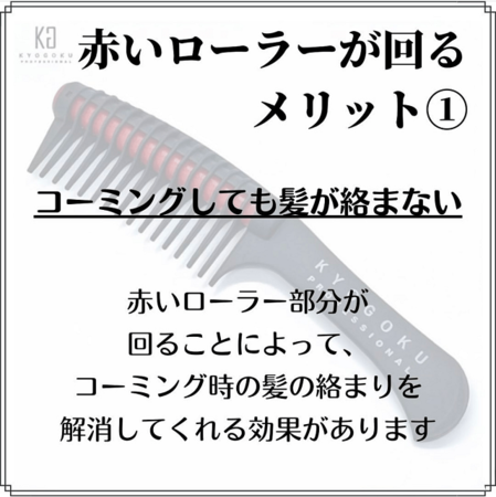 この【KYOGOKU ローラー ジャンボ コーム】の特徴は、コーミング時に摩擦が起きる部分が回転するので、摩擦を軽減し髪の毛の絡まりを抑えてくれます。