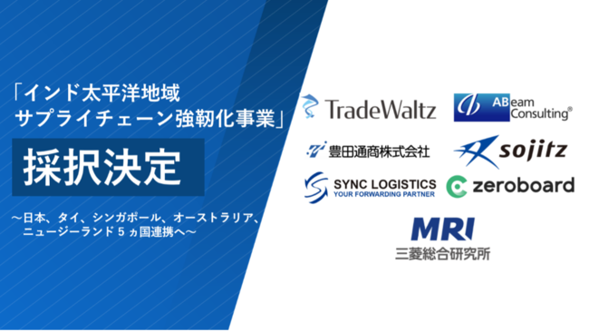 株式会社トレードワルツ(代表取締役社長 小島裕久、以下「トレードワルツ」)は、アビームコンサルティング株式会社(代表取締役社長 鴨居達哉)、豊田通商株式会社(取締役社長 貸谷伊知郎)、双日ロジスティクス株式会社(代表取締役社長 佐藤文彦)、シンク・ロジスティクス株式会社(代表取締役社長 一木貴大)、株式会社ゼロボード(代表取締役 渡慶次道隆)、株式会社三菱総合研究所(代表取締役社長 籔田健二、以下「MRI」)と協力し、一般社団法人日本機械工業連合会より、「インド太平洋地域サプライチェーン強靭化事業」に採択されたことをご報告いたします。(http://www.jmf.or.jp/topic01/2970.html)