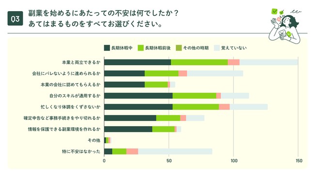 本調査では、時間に余裕ができる長期休暇前後を利用して、現在の仕事や収入、今後のキャリアと向き合い、副業にチャレンジしようとする方が多い一方で、実際に一歩踏み出すにあたっては、「本業と両立できるか」「自分のスキルが通用するか」といった不安を抱えている方が多いことがわかりました。