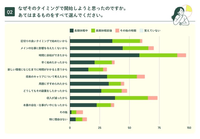 ・長期休暇中や長期休暇前後に副業を開始する理由の大半が「時間に余裕ができたから」。「将来のキャリアについて考えたから」という声も。