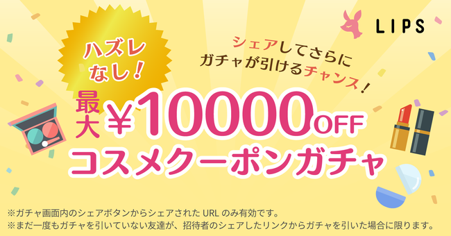 アプリ内のガチャ画面からガチャを引くと、『LIPSショッピング』で使えるいずれかのクーポンが抽選で必ず当たります。さらに、ガチャ画面から発行されるリンクをSNSで友達にシェア(招待)して、シェアしたリンクから友達がガチャを引くごとに、追加でガチャをもう一回引くことができます。なお、招待で増えるガチャ回数に上限はありません。