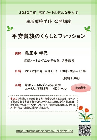 京都ノートルダム女子大学(学長:中村久美、所在地:京都府京都市左京区)は、2022年5月14日(土)に公開講座(参加費無料)を開催します。