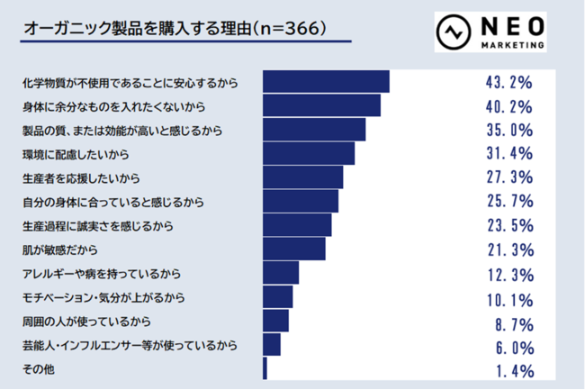 この割合は、「栄養価が高いと感じるから」「味が良いと思うから」といったオーガニックフードの質に関する理由よりも高くなっています。
