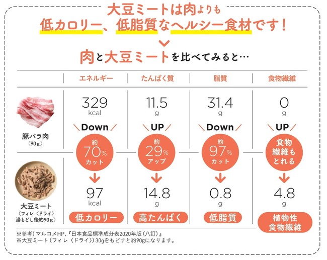 大豆ミート(フィレ〈ドライ〉)を豚バラ肉と比較すると、たんぱく質は約29%もアップする一方で、脂質は約97%減、エネルギーは約70%減!