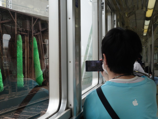 ツアーの最後は2000形の隣に停車していた1000形に乗車して、洗車の様子を車内から見学します。車の洗車と比較すると何倍も大きなブラシが高速で回転しながら、強い水圧で汚れを落としていく様子は、迫力満点。子ども達も窓に張り付きながら眺めていました。