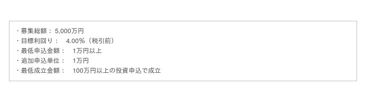 ポートフォリオにこのファンドのようなクラウドファンディングを取り入れることで、ポートフォリオのリターンをあげることができ、このファンドは1万円と少額から気軽に投資することができます。