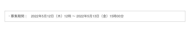 ※2022年5月12日(木)11時50分以降は、募集準備のため、募集開始まで商品公開を停止いたしますのでご了承いただきますようお願い申し上げます。