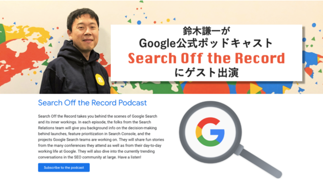 株式会社Faber Company(ファベルカンパニー/本社:東京都港区、代表取締役:稲次正樹、古澤暢央)は、同社取締役Search Advocate(サーチ・アドボケイト)鈴木謙一が、Google公式ポッドキャスト「Search Off The Record」2022年4月27日配信のエピソード36「The Story of Kenichi Suzuki」にゲスト出演したことを発表します。2020年9月から月2回のペースで公開されている同ポッドキャストで、Google社員以外がゲスト出演するのは2回目。Google の検索チーム(Search Relations Team)から依頼があったことで、実現いたしました。
