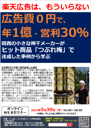 関西の小さな梅干メーカーがヒット商品「つぶれ梅」で広告0円で年2億円達成した楽天市場店長の南史哲様をお呼びして、『関西の小さな梅干メーカーがヒット商品「つぶれ梅」で広告0円で年2億円達成セミナー!!』を2022年5月30日(月)に開催いたします。