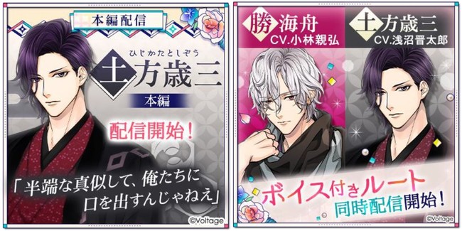 ボルテージ最新作「幕末維新 天翔ける恋」土方歳三( CV:浅沼晋太郎)の本編ストーリーとボイス付きルート、勝海舟(CV:小林親弘)のボイス付きルートが5月2日(月)より配信開始!
