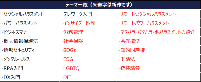 今回、SDGsやLGBTQなど、社員に基礎知識としてもってもらいたいという企業ニーズが増えているコンテンツを29種類追加したことが特徴となります。