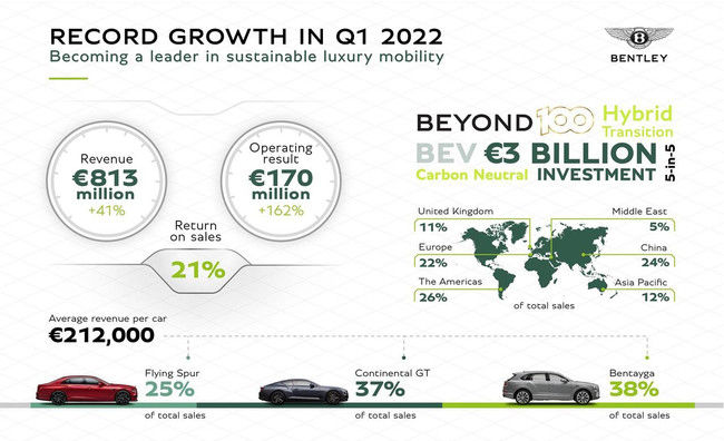 2022年第1四半期では、派生モデルの「マリナー」と「スピード」の人気が特に高く、1台あたりの収益が18万4000ユーロから21万2000ユーロに増加しました。この傾向が顕著であった欧州では販売台数が35%アップしています。世界的にはコンチネンタルGTの販売台数が全体で10%増加し、特にアジア太平洋地域と母国英国での販売増につながりました。