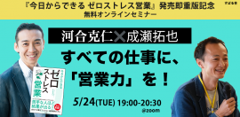『今日からできる ゼロストレス営業』発売即重版記念 河合克仁×成瀬拓也 【無料オンライントークライブ】 すべての仕事に「営業力」を!5月24日(火)19時より開催!