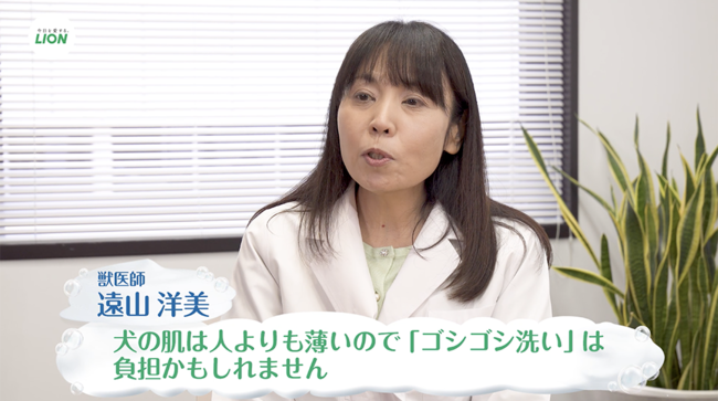 調査結果を受け獣医師の遠山洋美氏は、「シャンプーをごしごし泡立てながら洗うことは、犬の薄い皮ふに負担がかかる心配がある」と注意を促します。「犬の皮ふの最外層の表皮は、実は「ヒトの1/3 程度の薄さ」しかなく、とても繊細。低刺激性のシャンプーを使うことはもちろん、泡立ての必要がない『泡シャンプー』を使った、ごしごし摩擦の少ないやさしい洗い方がおすすめです」と、「洗い方」の重要性を指摘します。