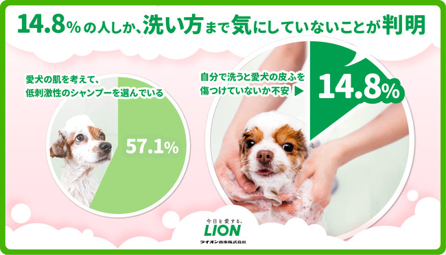 調査の結果、「愛犬のために低刺激性のシャンプーを選んでいる」と回答した人は全体の57.1%と過半数を超えており、「愛犬の皮ふにやさしくシャンプーをしたい」と思っている飼い主が多いことがわかりました。一方で、「自分で洗うと、愛犬の皮ふを傷つけていないか不安」と回答した人は全体の14.8%にとどまり、「洗い方による皮ふへの影響」に対する意識は低いという事実が判明しました。