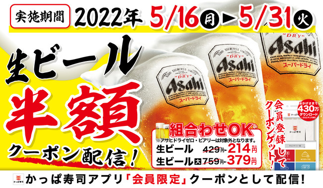 コロワイドグループのかっぱ寿司(カッパ・クリエイト(株) 本社:神奈川県横浜市)は、2022年5月16日(月)~5月31日(火)の期間、かっぱ寿司で使用できる「生ビール半額クーポン」をかっぱ寿司アプリ会員に配信いたします。