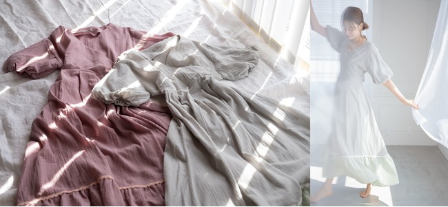 ワンピースLOVERの私のこだわりがたっぷり詰まったワンピース。締め付け感がないのに、スタイルアップをして見えるようにこだわりました。ポイントとしては背中にあるリボン!緩く結んだら、ふわっと感が出て、ゆったり過ごせる。&しっかり結ぶとラインが出てよりきれいなシルエットにもなります!裾に向かって大きく広がるように生地をたっぷり使っているのと、レーステープの切り替えもポイントです。また、袖のパフスリーブがふんわりリラックスで、二の腕部分を隠してくれるところもこだわりです。気分が上がるさわやかなミントと、きゅんとするピンクの2色展開です。ランジェリーセットアップと合わせて着ると、胸元からレースをチラ見せできるのでオススメです。
