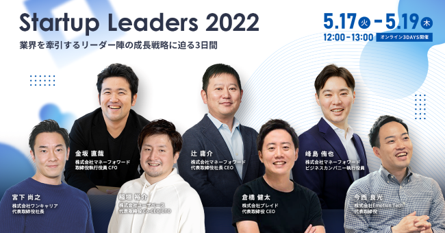 株式会社マネーフォワードは、2022年5月17日(火)~19日(木)に、スタートアップ、ベンチャー企業の経営者やCXOに向けたイベント「Startup Leaders 2022」をオンライン開催します。