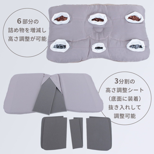 「みんまくグラン ファーストクラス」は、中材の調節部分が6つに分かれており、それぞれの詰め物を増減することで好みの高さ調整ができます。さらに底面に入っている調節用アジャスターシートは、左右+中央の3分割されており、中身のウレタンシートを抜き差しすることで、簡単に高さ調整が可能。じぶんに合った枕の高さにこだわって、心地よい寝心地を追及できます。