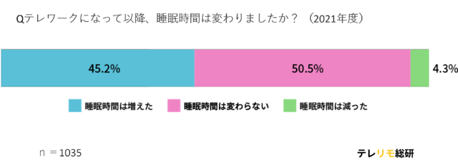 2020年の調査では、34.5%の方が『睡眠時間が増えた』と回答されていましたが、今回の調査ではさらに1割増え、45.2%となりました。半数には届かなかったものの、45%以上の方がテレワークになる以前より睡眠時間を多く確保できているようです。通勤がなくなって浮いた時間を『睡眠』に充てられるようになったことで、1日の睡眠時間も増えていると言えそうです。