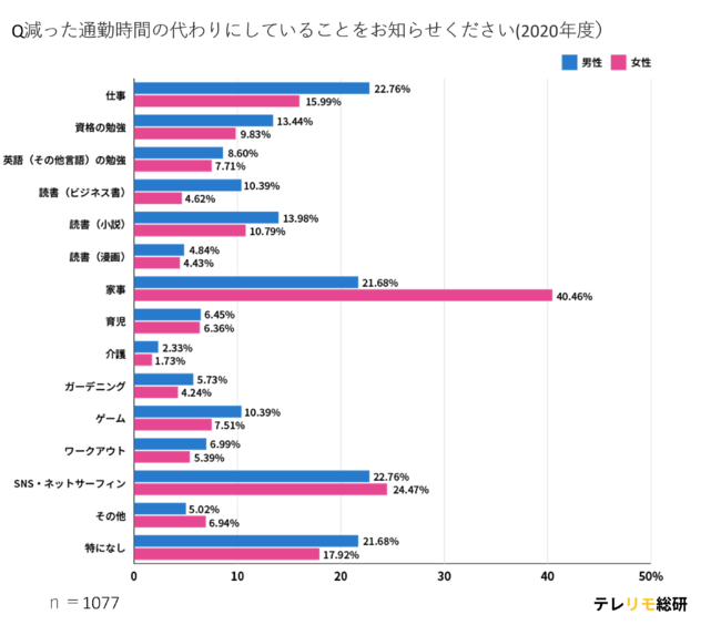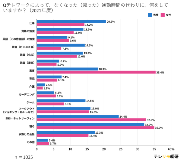 はじめに、世間の仕事環境がテレワークに移り変わりつつあった2021年、通勤時間が減ったことで何をしているかについてアンケートを実施しました。