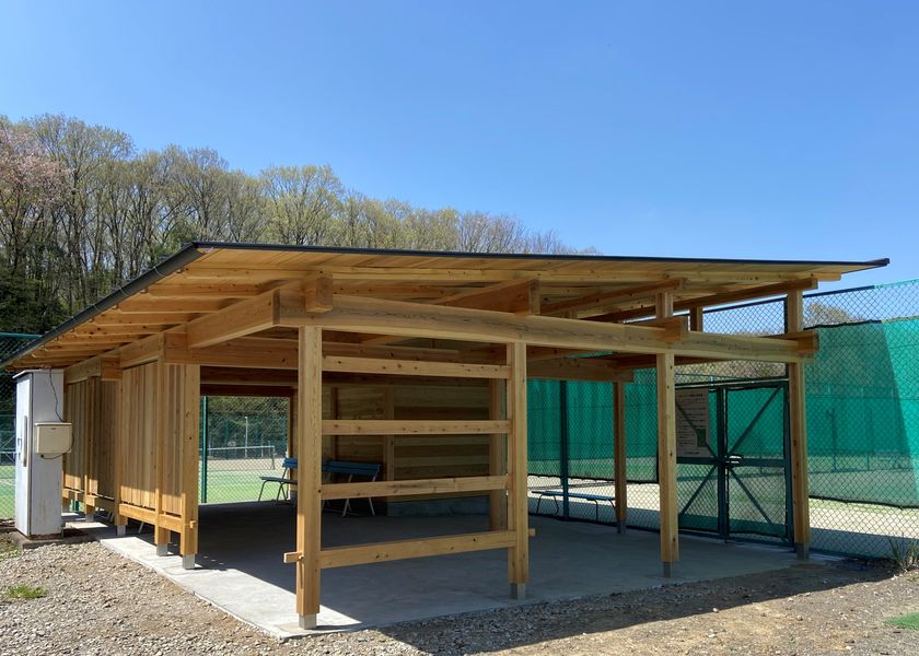 檜原村木材を使い、伝統的な木組みと継ぎで完成した工学院大学テニスコート用レストハウス