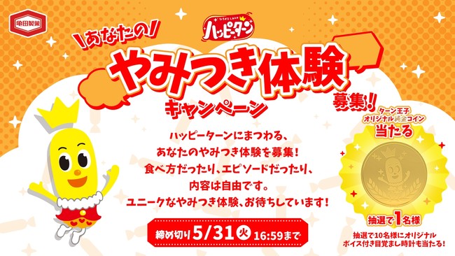亀田製菓株式会社(本社:新潟県新潟市、代表取締役社長 COO:佐藤 勇)は、「ハッピーターンあなたのやみつき体験募集!キャンペーン」を5月16日(月)10:00より実施いたします。応募いただいた方には、抽選で「ターン王子オリジナル純金コイン」や、「オリジナルボイス付き目覚まし時計」が当たります。