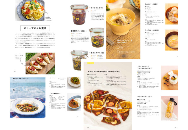 本書では、自宅のベランダや庭などのスペースを活用して、ドライフードを作るノウハウと、ドライフード活用レシピをわかりやすく紹介。野菜、きのこ、果物、肉、魚など、食材それぞれの切り方・干し方(時間・日数)と、ビフォー/アフターの写真をふんだんに使用し、誰でも簡単にドライフードづくりのコツがわかります。